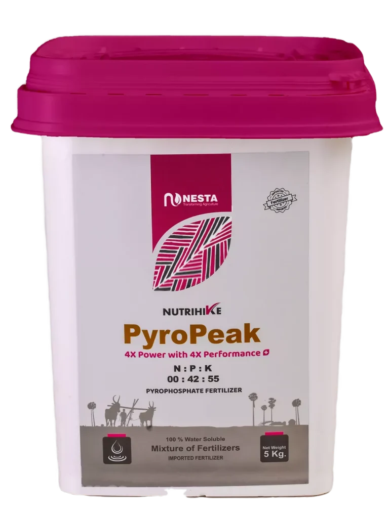 NUTRIHIKE PYROPEAK is a free-flowing pyrophosphate super speciality 100% water-soluble fertilizer containing Phosphorus and Potassium (42% of P2O5 and 55 % of K2O).
